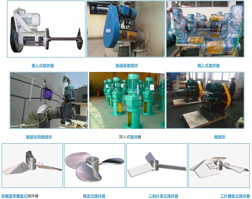 頂入式攪拌器由電動機、減速機、機架、攪拌軸、攪拌槳等組成,側進式攪拌器由電動機、減速機、機架、機座板、機械密封、攪拌軸、攪拌槳等組成,結構緊湊、安裝維護方便。過流部件可抵抗高濃度氯離子的腐蝕。