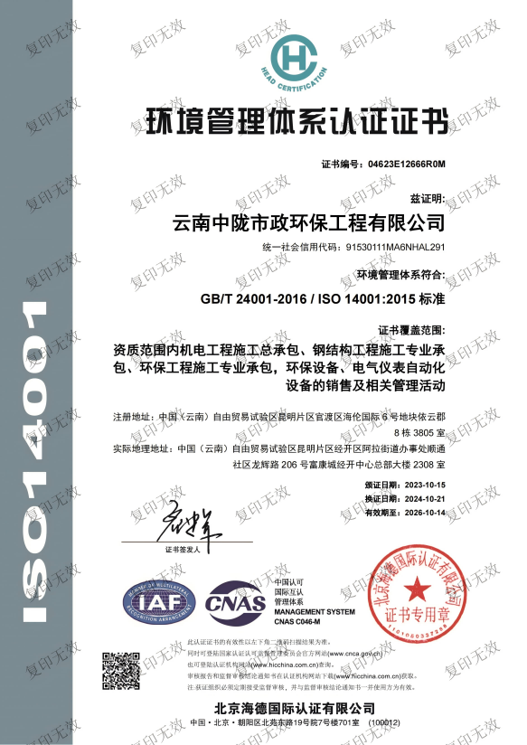 ISO14001環(huán)境管理體系認證證書