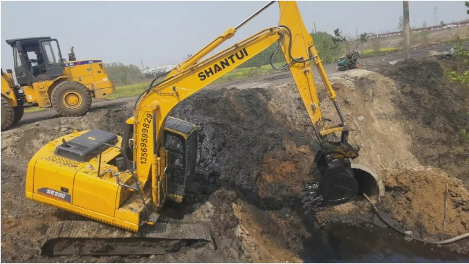 督察人員到達(dá)現(xiàn)場(chǎng)時(shí),大型施工機(jī)械正在天瑞焦化廠區(qū)外排水溝渠緊急清理漂著油花的污水和底泥,場(chǎng)面一度混亂不堪,焦油味十分刺鼻。