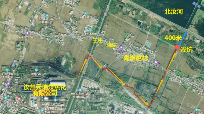 這些污水經(jīng)過一片農(nóng)田間的溝渠,蜿蜒流入一個(gè)沒有任何防滲措施的污水坑。這個(gè)坑距當(dāng)?shù)?ldquo;母親河”汝河不足400米。
