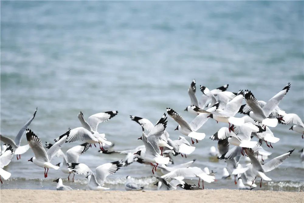 4月8日,一群棕頭鷗在青海湖岸邊飛翔。新華社記者 吳剛 攝