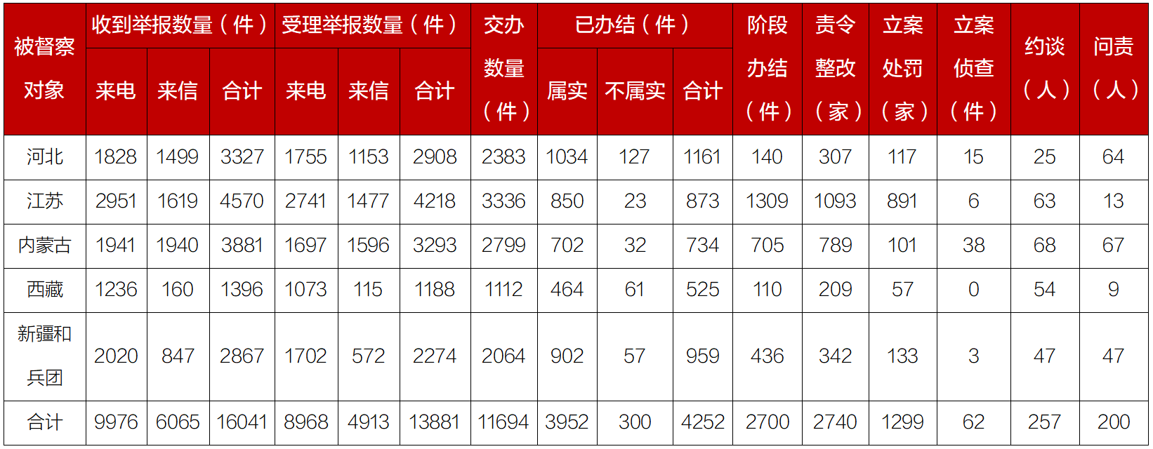 有關?。ㄇ┖捅鷗叨戎厥傭講旃ぷ?,將督察作為堅決貫徹習近平生態文明思想的重要內容,作為推動高質量發展的重要契機,主要領導通過督察動員、現場督辦、召開專題會議等方式,大力推動整改落實。截至4月25日,各督察組共收到群眾來電、來信舉報16041件,受理有效舉報13881件,經梳理合并重復舉報,累計向相關省(區)和兵團轉辦11694件。相關省(區)和兵團已辦結或階段辦結6952件。其中,立案處罰1299家,立案偵查62件;約談黨政領導干部257人,問責黨政領導干部200人。