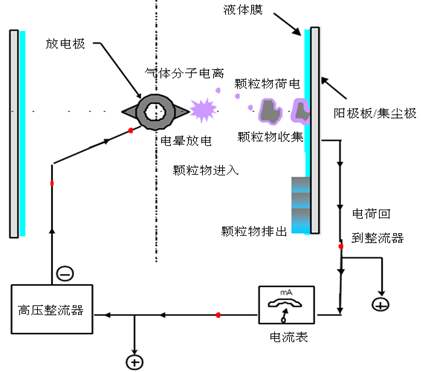 濕式電除塵(霧)器是由陰極線和陽極管(沉淀級)組成的,是高效濕法氣液分離設備,捕集煙氣中含微米、亞微米級塵粒子及霧氣。在高壓靜電作用下,電暈陰極線不斷放射出電子,把電極間氣體電離成正負電子。塵、霧滴等顆粒碰到電子而產生荷電,按照同性相斥、異性相吸原理,荷電后塵、霧滴向電極性相反的電極移動,正離子向電暈極移動,電子及負離子則移向沉淀電極,并將電子移向沉淀極。失去電子的塵、霧滴顆??孔災爻戀磯靡勻コ?,使出口煙氣達到環保排放標準。