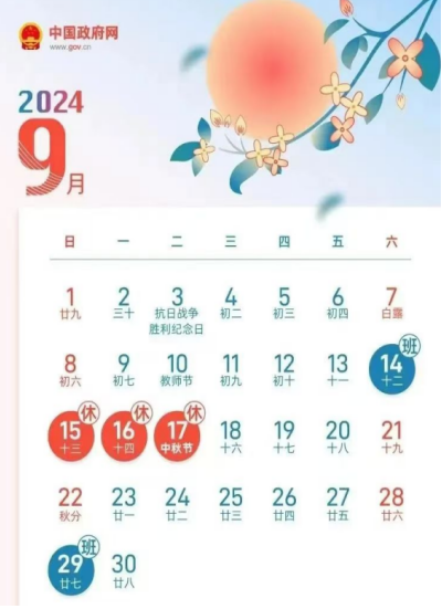 09月15日至17日放假調休共3天,09月14日(星期六)正常上班。