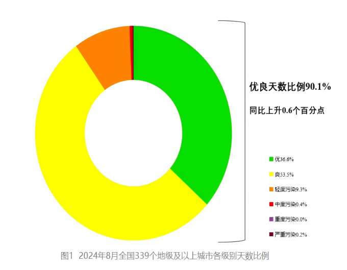 8月,全國339個地級及以上城市平均空氣質量優良天數比例為90.1%,同比上升0.6個百分點;平均重度及以上污染天數比例為0.2%,同比下降0.1個百分點;由沙塵天氣導致的平均超標天數比例為0.9%,其中重度及以上污染天數比例為0.2%。