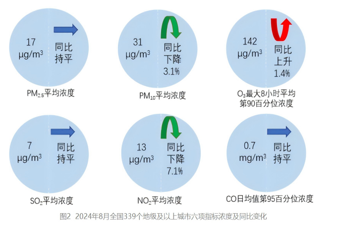 8月,全國339個地級及以上城市PM2.5平均濃度為17微克/立方米,同比持平;PM10平均濃度為31微克/立方米,同比下降3.1%;O3平均濃度為142微克/立方米,同比上升1.4%;SO2平均濃度為7微克/立方米,同比持平;NO2平均濃度為13微克/立方米,同比下降7.1%;CO平均濃度為0.7毫克/立方米,同比持平。