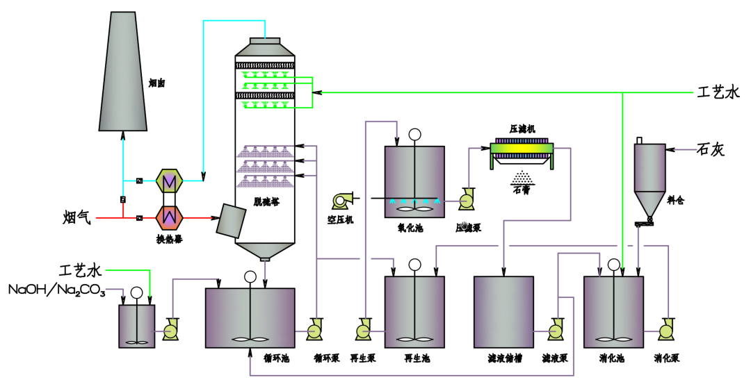整個雙堿法脫硫工藝由五個工序組成:脫硫工序、再生工序、氧化工序、石膏脫水工序、制漿工序。