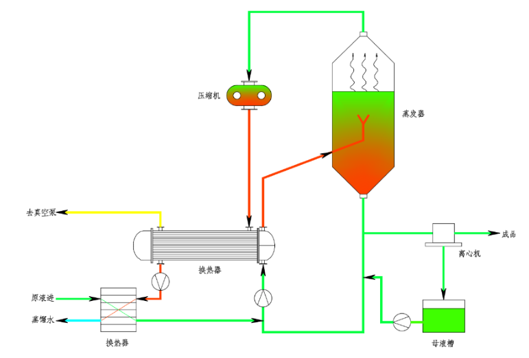 蒸發產生的低溫位二次蒸汽經壓縮機壓縮,把電能轉換成熱能,蒸汽的溫度、壓力與熱焓提高,蒸汽重新進入蒸發器的加熱室,作為熱源將料液維持在沸騰狀態,蒸汽本身則冷凝成水。該原理使原本要廢棄的蒸汽得到了充分的利用,回收的汽化潛熱提高了熱效率,因此,除設備啟動外,整個蒸發過程中無需新的工業蒸汽。
