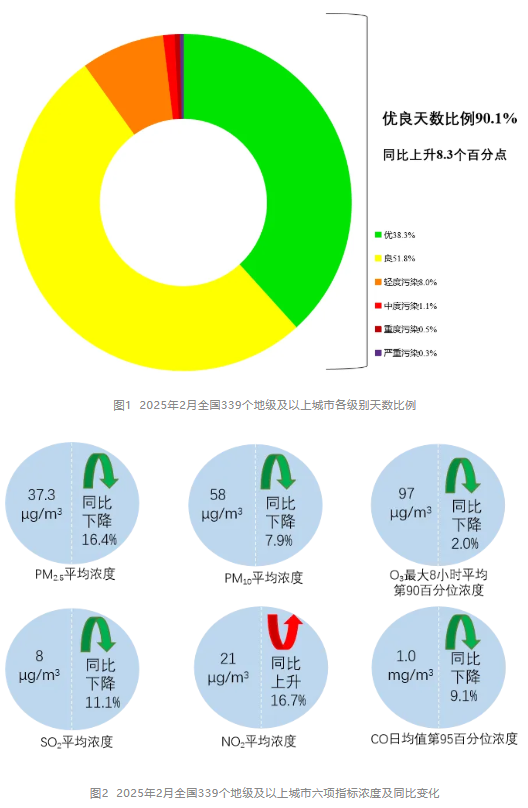 2月,全國339個地級及以上城市PM2.5平均濃度為37.3微克/立方米,同比下降16.4%;PM10平均濃度為58微克/立方米,同比下降7.9%;O3平均濃度為97微克/立方米,同比下降2.0%;SO2平均濃度為8微克/立方米,同比下降11.1%;NO2平均濃度為21微克/立方米,同比上升16.7%;CO平均濃度為1.0毫克/立方米,同比下降9.1%。
