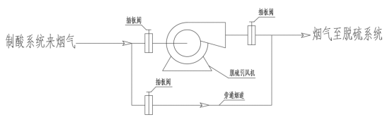 在脫硫引風機進出口及旁通煙道上各安裝一套插板閥,當脫硫引風機發生故障時,可及時打開旁通煙道上的插板閥使煙氣從旁通煙道流至脫硫系統。由于煙氣中酸霧濃度較高,煙道材質采用碳鋼外包玻璃鋼。通過增設旁通煙道可避免因脫硫引風機發生故障而引發的事故,同時可以更快地對引風機進行維修并恢復生產。旁通煙道流程示意圖如下: