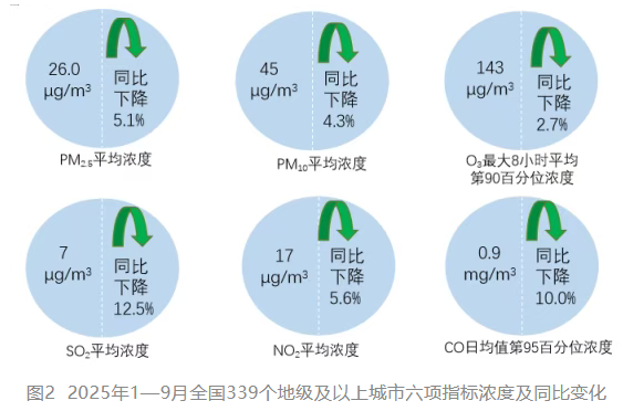 1—9月,全國339個地級及以上城市PM2.5平均濃度為26.0微克/立方米,同比下降5.1%;PM10平均濃度為45微克/立方米,同比下降4.3%;O3平均濃度為143微克/立方米,同比下降2.7%;SO2平均濃度為7微克/立方米,同比下降12.5%;NO2平均濃度為17微克/立方米,同比下降5.6%;CO平均濃度為0.9毫克/立方米,同比下降10.0%。
